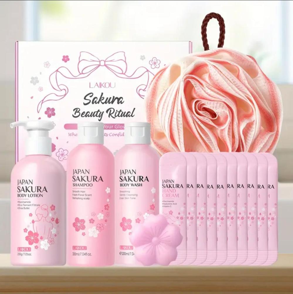 العناية بالجسم من ساكورا تحتوي على 15 قطعة , لوشن للجسم 200 مل, شامبو و غسول الحمام 200 مل, صابون تنظيف ناعم 70 مل , كريم لليدين , اسفنج استحمام